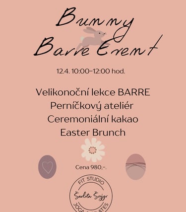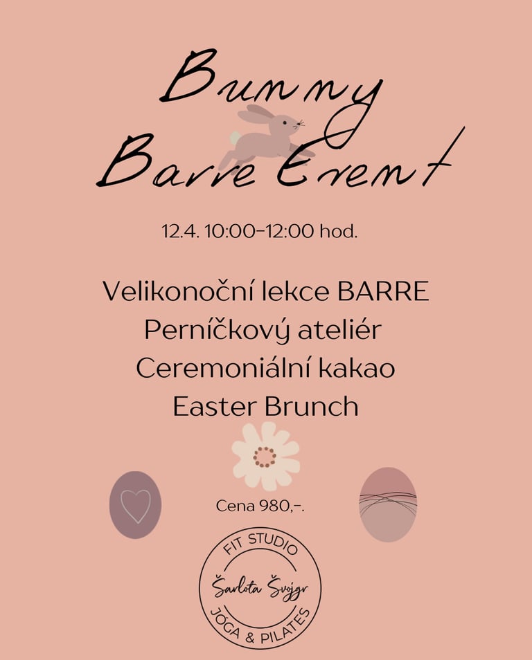 Čeká Vás: Ceremoniální kakao pro klid těla i mysli. Velikonoční lekce BARRE a krátký strečink s pěnovým válcem. Perníčkový ateliér, kde necháme prostor Vaší kreativitě, perníček si pak můžete odnést jako vzpomínku, nebo si ho dát ke kávě. A na závěr náš skvělý EASTER brunch (slaný i sladký).